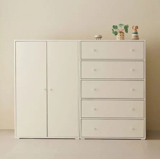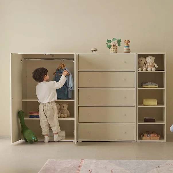 옷장과 서랍장을 세트로 구성하면 좁은 방에서도 버리는 공간 없이 효율적인 수납이 가능해요. 특히 옷걸이와 서랍이 결합된 형태가 아이 옷 정리에 가장 실용적입니다.