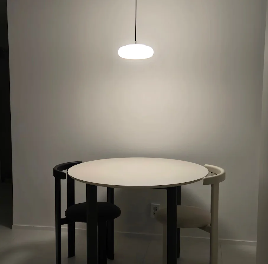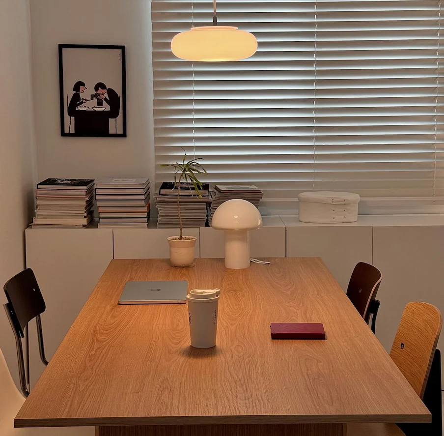 다이닝 테이블 위나 거실 중앙에 떨어지는 펜던트 조명은 공간의 시각적 무게중심을 잡아주는 역할을 해요. 원형 식탁 위 은은한 펜던트 조명과 모던한 디자인 체어를 조화롭게 배치하면 카페 부럽지 않은 홈카페 분위기를 낼 수 있더라고요. 이때 조명의 높이는 테이블 상판에서 약 60~70cm 정도 띄우는 것이 눈부심도 적고 가장 예뻐 보이는 비율이에요.