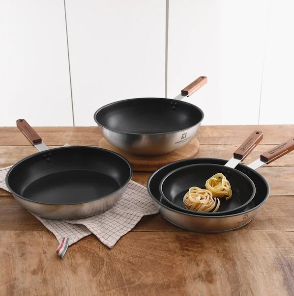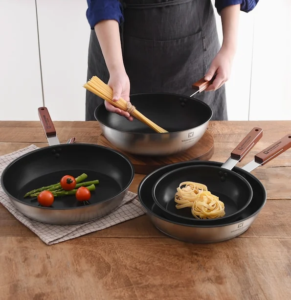 이 프라이팬 세트는 특유의 은은한 광택 덕분에 오픈형 주방에 그대로 올려두어도 훌륭한 홈데코 오브제가 됩니다. 원룸이나 20평대 초반의 좁은 주방에서도 답답해 보이지 않고 오히려 세련된 느낌을 주는 것이 특징이에요.